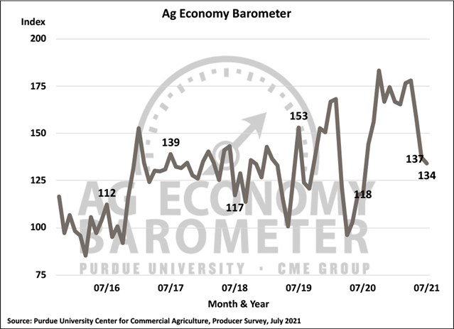 This month’s sentiment index was the weakest barometer reading since July of 2020 and marked a return to sentiment readings observed from 2017 through 2019 when annual average barometer readings ranged from 131 to 133. Ag producers’ sentiment regarding current conditions weakened in July. The Index of Current Conditions, at 143, fell 6 points below June’s value as principal crop prices weakened. The Index of Future Expectations also softened, but at 130 was just 2 points below a month earlier. The Purdue University-CME Group Ag Economy Barometer sentiment index is calculated each month from 400 U.S. agricultural producers’ responses to a telephone survey. This month’s survey was conducted from July 19-23, 2021.