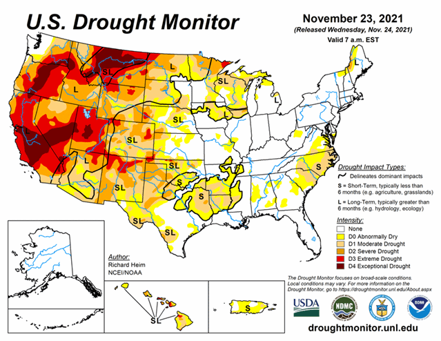 In addition to the massive drought in the West and into the Plains/Upper Midwest, a few other areas of high concern have appeared. Conditions are quickly deteriorating in the South/Southeast and Hawaii. As of November 23, 2021, 42.3% of the U.S. and 50.5% of the lower 48 states are in drought.