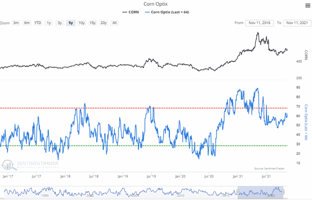 So when Public Opinion moves above the red dotted line in the chart, it means that compared to other readings over the past year, you're seeing excessive optimism. You also want to look at the absolute level of Opinion, too - if it's at 90%, then there's no question we're seeing an historic level of bullish opinion. Watch for readings above 80% (or especially 90%) to spot those dangerous times when the public is overly enthusiastic about a commodity.