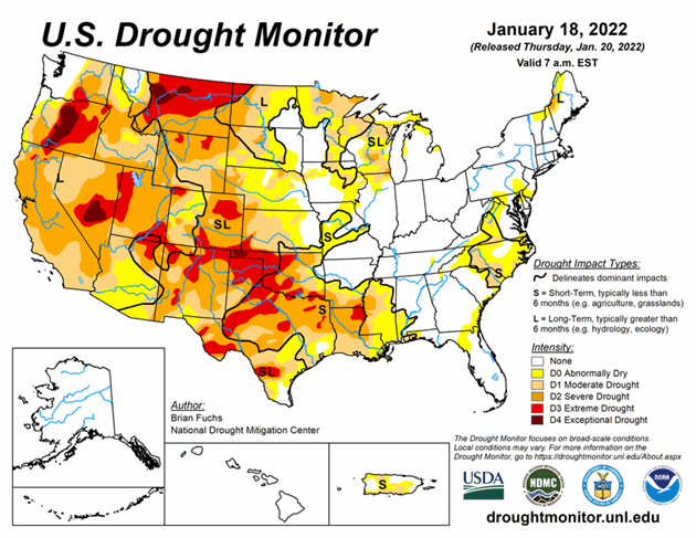 It was another dry week out West. The very wet December helped, but more precipitation is needed. Drought in the Southern Plains continues to worsen. According to the U.S. Drought Monitor, Oklahoma has an area of Exceptional Drought (D4) for the first time since 2018. As of January 18, 2022, 46% of the U.S. and 55% of the lower 48 states are in drought.