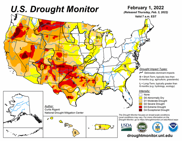 2022 trends continue. This past week was status quo out West as a dry January was counterbalanced by the wet December—but early February looks dry too. Meanwhile in the South, southeastern Texas saw heavy rain, but drought conditions worsened in other parts of Texas, Louisiana, and Arkansas. As of February 1, 2022, 46.33% of the U.S. and 55.2% of the lower 48 states are in drought.
