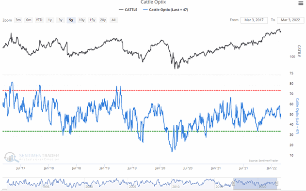 So when Public Opinion moves above the red dotted line in the chart, it means that compared to other readings over the past year, you're seeing excessive optimism. You also want to look at the absolute level of Opinion, too - if it's at 90%, then there's no question we're seeing an historic level of bullish opinion. Watch for readings above 80% (or especially 90%) to spot those dangerous times when the public is overly enthusiastic about a commodity.