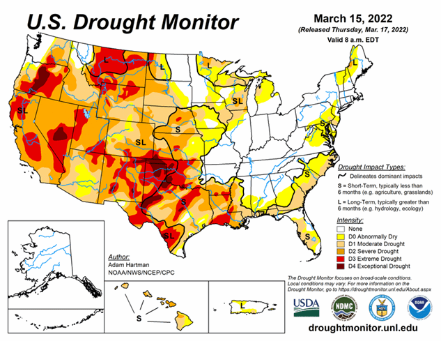 Conditions are deteriorating in the two biggest states in the Lower 48: California saw a large expansion of Extreme Drought (D3) while Texas saw Exceptional Drought (D4) develop in a number of places, according to the latest U.S. Drought Monitor. As of March 15, 2022, 51.09% of the U.S. and 60.98% of the lower 48 states are in drought.
