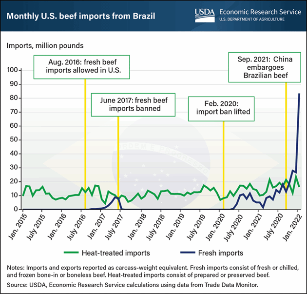 Historically, imports from Brazil primarily consisted of heat-treated beef products, including prepared or preserved beef. In February 2020, the USDA Food Safety and Inspection Service determined that fresh beef from Brazil was eligible for import. As a result, beef imports from Brazil have risen. Record high U.S. beef prices and drought-impacted supplies in Australia, where the United States would otherwise source beef, have also contributed to growing imports of processing-grade beef from Brazil.