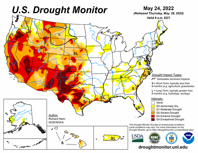 There was a bit of a divergence with the two most drought-stricken regions this week. The Southwest continued to worsen, while the Southern Plains got drenched. Even so, the western Southern Plains remain exceptionally dry. As of May 24, 2022, 42.41% of the U.S. and 50.66% of the lower 48 states are in drought.