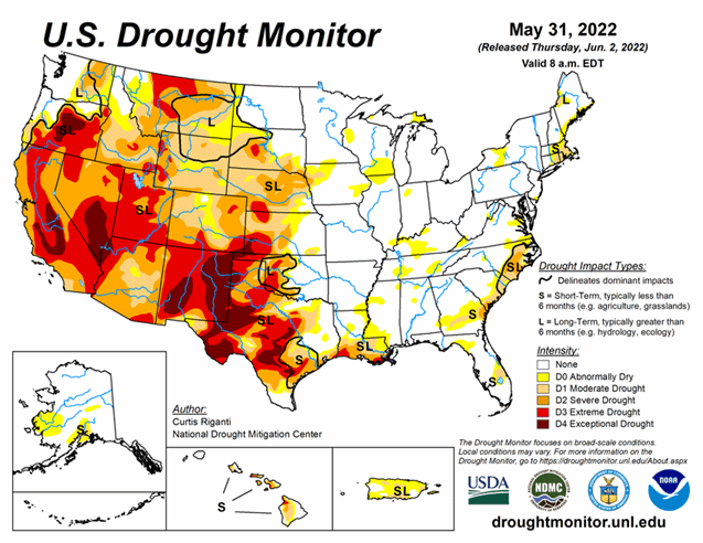 It's meteorological summer, and this past week brought a bit of good drought news. Parts of the Northwest, Rockies, and Great Plains saw good precipitation and drought improvements. However, California and the Southwest have stayed dry—and heat is coming. As of May 31, 2022, 41.4% of the U.S. and 49.3% of the lower 48 states are in drought.