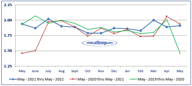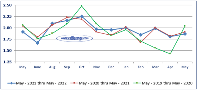 Marketings of fed cattle during May totaled 1.91 million head, 2 percent above 2021.