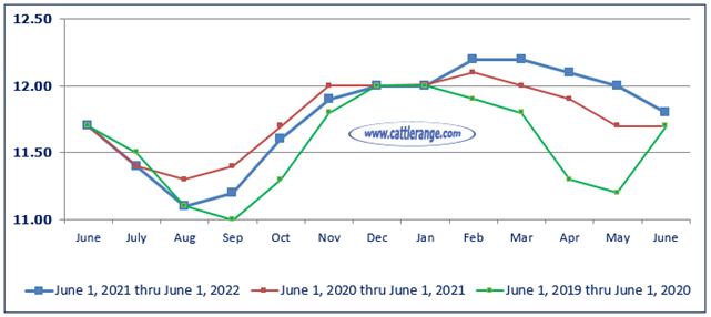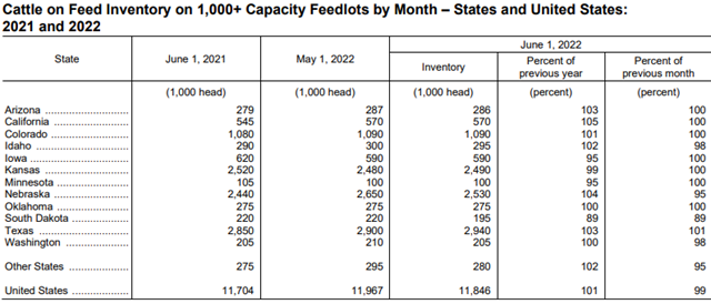 Cattle and calves on feed for the slaughter market in the United States for feedlots with capacity of 1,000 or more head totaled 11.8 million head on June 1, 2022. The inventory was 1 percent above June 1, 2021. This is the highest June 1 inventory since the series began in 1996.