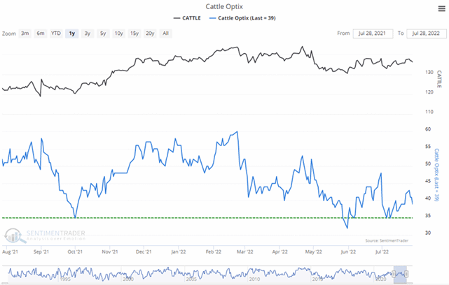 So when Public Opinion moves above the red dotted line in the chart, it means that compared to other readings over the past year, you're seeing excessive optimism. You also want to look at the absolute level of Opinion, too - if it's at 90%, then there's no question we're seeing an historic level of bullish opinion. Watch for readings above 80% (or especially 90%) to spot those dangerous times when the public is overly enthusiastic about a commodity.