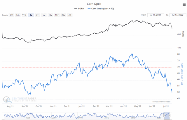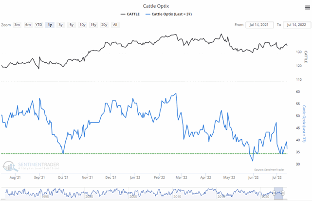 So when Public Opinion moves above the red dotted line in the chart, it means that compared to other readings over the past year, you're seeing excessive optimism. You also want to look at the absolute level of Opinion, too - if it's at 90%, then there's no question we're seeing an historic level of bullish opinion. Watch for readings above 80% (or especially 90%) to spot those dangerous times when the public is overly enthusiastic about a commodity.