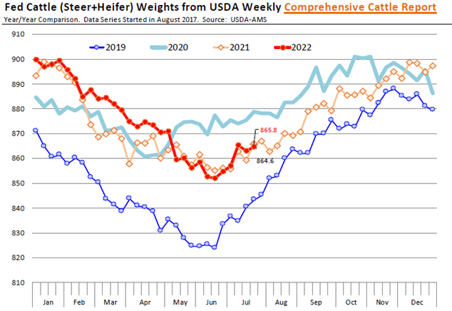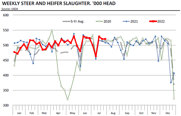 Fed cattle slaughter last week was estimated at 520k head, 1.1% higher than the previous year and we think slaughter this week will be close to those levels again and about 2% higher than a year ago. During the four full July weeks, fed cattle slaughter is estimated up 2% compared to the same four weeks in 2021. And yet, we still think that when the next feedlot survey is released in August, marketings for the month of July will be down from the previous year. Monthly figures are often skewed by the number of Saturdays and Sundays included and July 2022 has one more Sunday than July 2021. That will be enough to result in lower July total slaughter. Our current guess is that feedlot marketings for July will be down about 2.5‐3.0% compared to last year. Because of that, the July feedlot turnover rate (ratio of marketings to inventory of cattle with +90 days on feed) to under 30%, a fairly low number for this time of year.