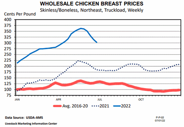 Not pictured here today but the U.S. consumer continues to demand higher volumes of chicken. Even with high prices in the last three years, chicken at the retail level has moved extremely well. Research has shown chicken own price elasticity is less elastic than beef or pork, meaning as price increases the quantity demanded is slower to respond. Chicken consumption on a per capita basis has climbed since the base year of 2000 and in 2021 was 20 pounds higher than 2000. In the face of high inflation, it’s expected that chicken will continue to move well at the retail level, but in recent weeks certain wholesale cut prices have come off previous peaks. Boneless skinless chicken breast wholesale prices are down 60 cents per pound in the last six weeks.