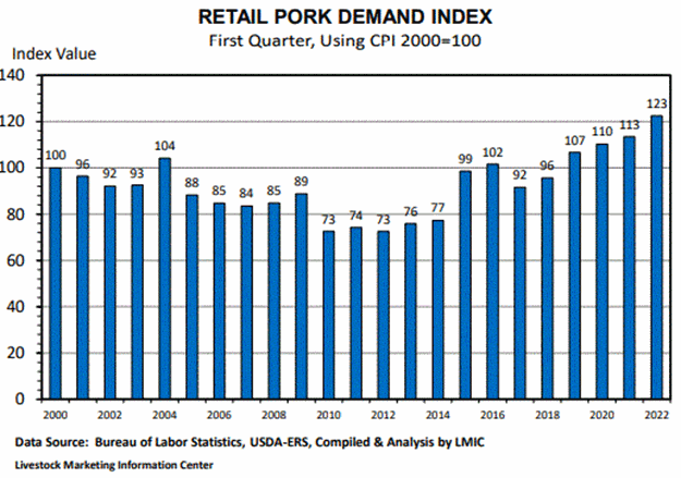 The all fresh pork index saw a first quarter buoy of 123, up from 113 the prior year. Annually, 2021, 2020, and 2019 all set new annual highs for retail pork demand. Those three years showed quarters 1, 3, and 4 increasing very sharply, while the second quarter index values pulled back rather abruptly from a high 2019.