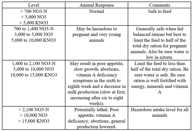 Forage testing laboratories report nitrate results in different ways. Guidelines for forage nitrate tests depend on the unit being presented. Results can be based on nitrate (NO3), nitrate-nitrogen (NO3-N), or potassium nitrate (KNO3). The toxicity levels are broken down in the following table.