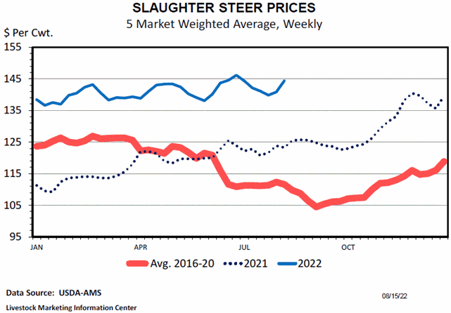 Placement estimates look to still be heavily drought influenced. Analysts predicted placements would be both higher and lower than last year with a range of 96% to 101.3% of a year ago. The pre-report average was 98.9%. Weekly feeder cattle and stocker receipts released by USDA AMS indicated smaller total volumes versus 2021. Interestingly and somewhat conflicting with the drought theme is the percent in the weekly receipts that are over 600 pounds. Typically, when placements are placed in summer months due to drought cattle enter feedlots at light weights. Auction data reported 63% of total receipts were over 600 pounds compared to 58% last year. Direct sales reported 91% over 600 pounds versus 92% in 2021. Video/Internet auctions reported 79% were over 600 pounds in July of 2022 versus 71%.