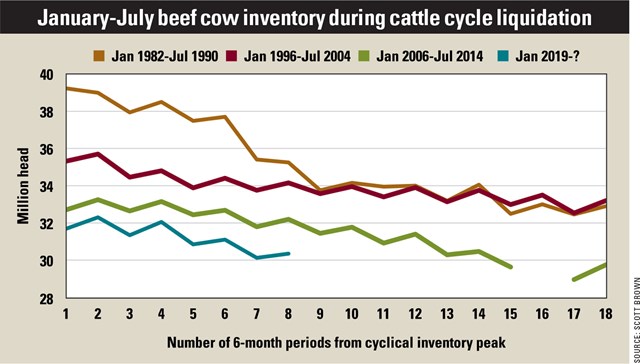 The duration of the liquidation phase of the previous three cycles lasted for eight or nine years, although there were a couple of observations of modest growth in years six and seven of the 1980s cycle before declines resumed. If you use previous cycles as a gauge, the beef cattle industry is near the halfway point of liquidation.