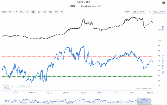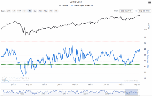 So when Public Opinion moves above the red dotted line in the chart, it means that compared to other readings over the past year, you're seeing excessive optimism. You also want to look at the absolute level of Opinion, too - if it's at 90%, then there's no question we're seeing an historic level of bullish opinion. Watch for readings above 80% (or especially 90%) to spot those dangerous times when the public is overly enthusiastic about a commodity.