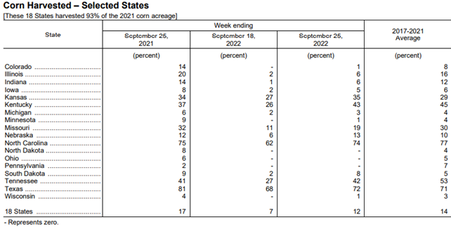 Percent of Corn Crop Harvested running 2% behind 5 Year Average