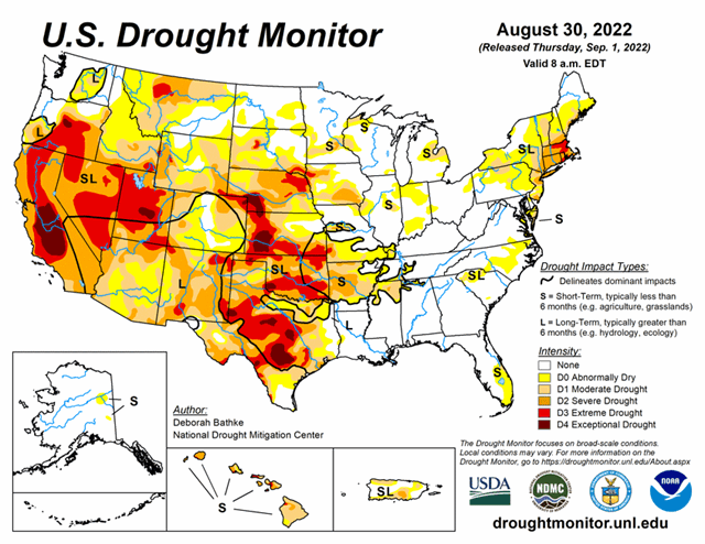 This week brought more major improvements across the southern U.S., particularly the Southwest and Texas (where more rain is coming). Montana, the Central Plains, the Northeast, and Hawaii saw the most degradations. As of August 30, 2022, 38.23% of the U.S. and 45.53% of the Lower 48 states in drought.