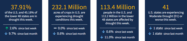 As of September 13, 2022, 37.91% of the U.S. and 45.18% of the lower 48 states are in drought.