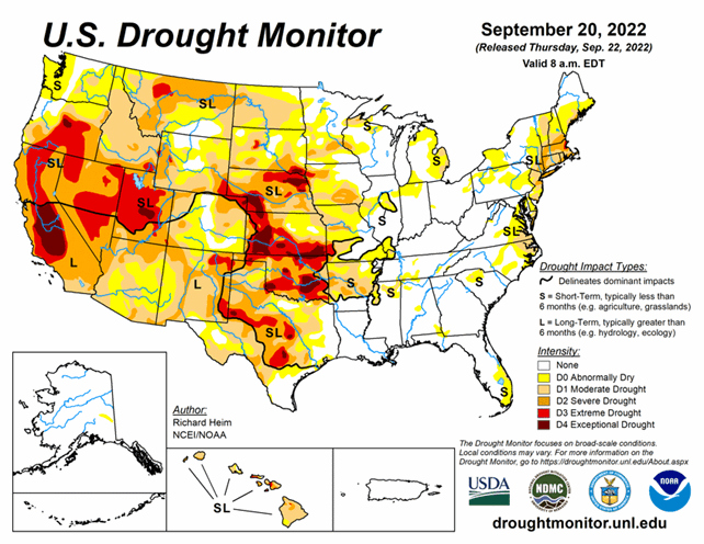 As of September 20, 2022, 41.02% of the U.S. and 48.91% of the lower 48 states are in drought.