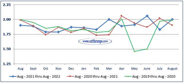 Marketings of fed cattle during August totaled 2.00 million head, 6 percent above 2021.
