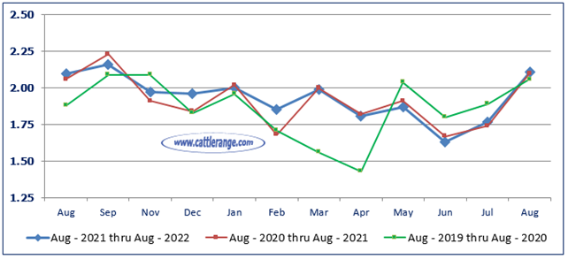 Placements in feedlots during August totaled 2.11 million head, slightly above 2021. Net placements were 2.06 million head. During August, placements of cattle and calves weighing less than 600 pounds were 430,000 head, 600-699 pounds were 320,000 head, 700-799 pounds were 465,000 head, 800-899 pounds were 532,000 head, 900-999 pounds were 270,000 head, and 1,000 pounds and greater were 95,000 head.