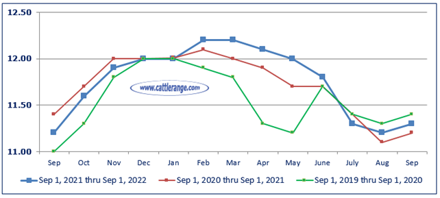 Cattle and calves on feed for the slaughter market in the United States for feedlots with capacity of 1,000 or more head totaled 11.3 million head on September 1, 2022. The inventory was slightly above September 1, 2021. This is the second highest September 1 inventory since the series began in 1996.
