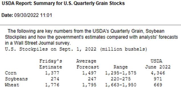 USDA Report Summary for U.S. Quarterly Grain Stocks