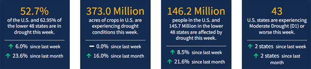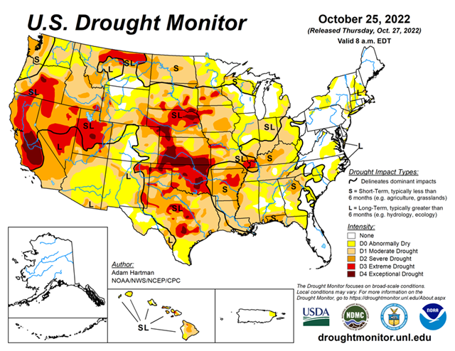 According to October 25, 2022 U.S. Drought Monitor, 52.70% of the U.S. and 62.95% of the Lower 48 states are in drought.