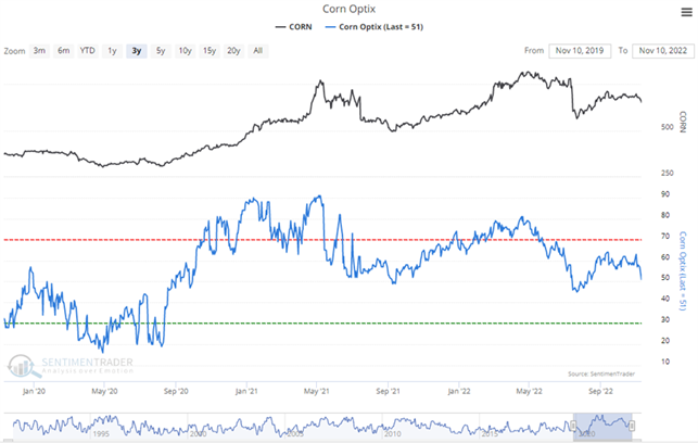 So when Public Opinion moves above the red dotted line in the chart, it means that compared to other readings over the past year, you're seeing excessive optimism. You also want to look at the absolute level of Opinion, too - if it's at 90%, then there's no question we're seeing an historic level of bullish opinion. Watch for readings above 80% (or especially 90%) to spot those dangerous times when the public is overly enthusiastic about a commodity.