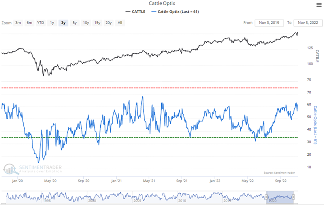 So when Public Opinion moves above the red dotted line in the chart, it means that compared to other readings over the past year, you're seeing excessive optimism. You also want to look at the absolute level of Opinion, too - if it's at 90%, then there's no question we're seeing an historic level of bullish opinion. Watch for readings above 80% (or especially 90%) to spot those dangerous times when the public is overly enthusiastic about a commodity.