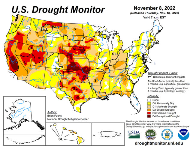 As of November 8, 2022, 50.46% of the U.S. and 60.34% of the lower 48 states are in drought, according to the U.S. Drought Monitor.