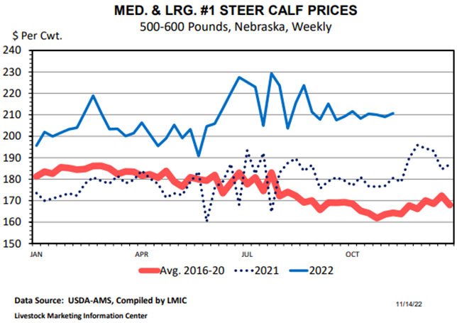 Starting with Montana combined auctions, October and November weekly prices have hovered under and over $200 per cwt for the last 6 weeks or so, and ultimately averaged just below $200 per cwt in October for 500-600 pound steer calves. South Dakota 500-600 pound steers have averaged over $200 per cwt monthly since June of 2022 and were at a relative high point in October, averaging $216 per cwt. November looks like it will post a similar average price point. Lighter weight steers have been commanding well over $200 per cwt for more than a year. Nebraska 500-600 pound steer calves averaged $210 per cwt in October, slightly above September but lower than prices were over the summer. June-August averaged $212 and above per cwt. Similar to South Dakota, Nebraska 300-400 pound steers and 400-500 pound steers have averaged over $200 per cwt on a monthly basis for more than a year.