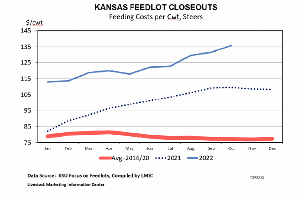 High grain prices have been the focus of much discussion in 2022. As I write this, CME© corn futures are trading in the mid-$6 per bushel range through next summer. This story is likely best told by looking at the chart below, which summarizes feed cost per lb of gain from Kansas State’s Focus on Feedlots data. The most recent feed cost of gain estimate from participating feed yards exceeds $1.35 per lb. And projected cost of gain is even higher for cattle that are currently being placed. As a comparison, the average feed cost per lb of gain was about $0.79 from 2016 to 2020. High cost of gain incentivizes the placement of heavier feeder cattle into finishing programs.