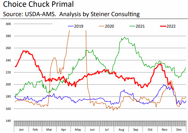 The rib primal value peaked at the end of November at $536.5/cwt, almost $100/cwt higher (+22%) than at the start of November, adding around $11/cwt to the overall cutout value. The big gains in the value of the rib primal, and to a lesser extent the loin primal, helped offset the weakness in round and chuck cuts last month. The chuck primal rallied hard in late October but by the end of November it was down $39/cwt or 17% from its peak. Chuck prices have continued to lose ground so far in December and the same can be said about rounds as well.