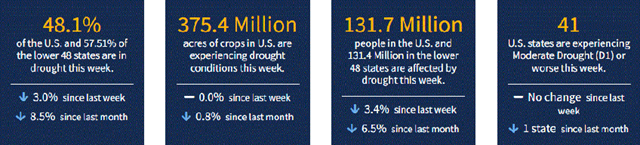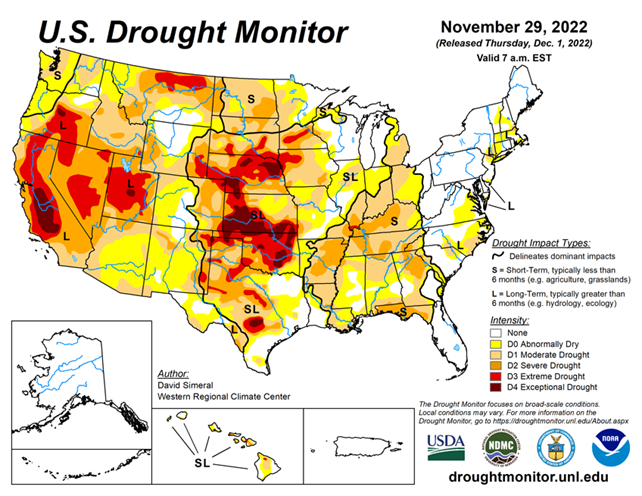 As of November 29, 2022, 48.10% of the U.S. and 57.51% of the lower 48 states are in drought, according to the U.S. Drought Monitor.