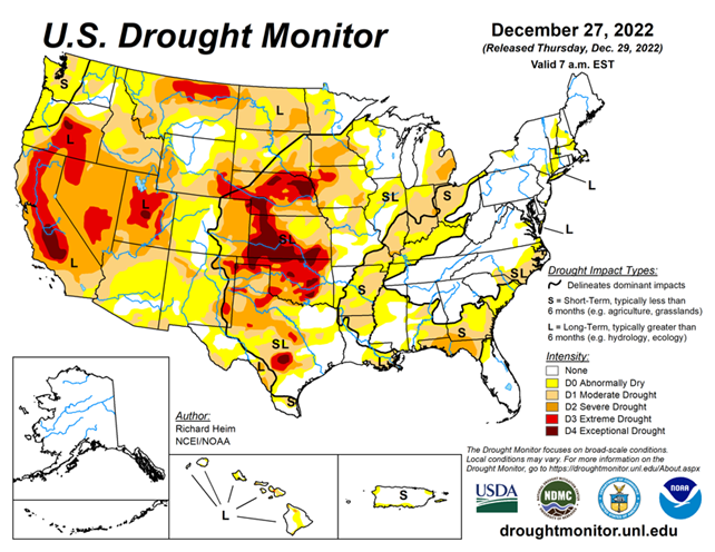 As of December 27, 2022, 41.50% of the U.S. and Puerto Rico and 49.65% of the lower 48 states are in drought, according to the U.S. Drought Monitor.