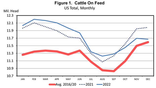 The final USDA Cattle on Feed report for the year shows that feedlot inventories continue to decrease. The December 1 total of cattle in feedlots was 11.673 million head, down 2.6 percent year over year and the third consecutive monthly year over year decrease in 2022 (Figure 1). November placements were down 2.1 percent year over year; a bit larger than expected, but still down for the third consecutive month. Feedlot marketings in November were about as expected, up 1.2 percent year over year.