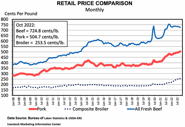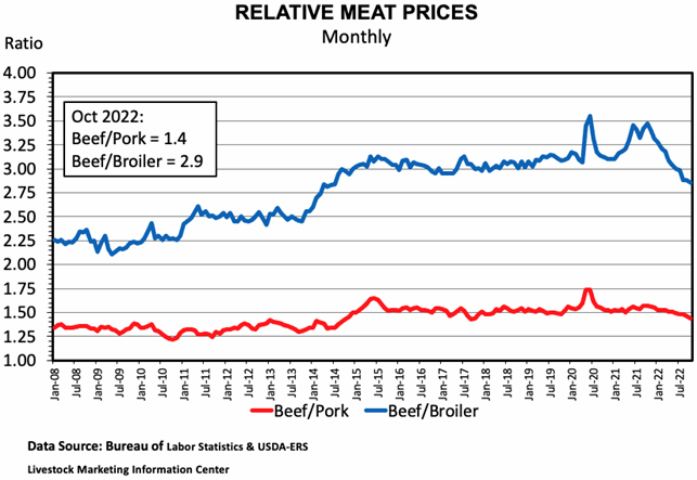 One way to examine the relative price competitiveness of beef is to look at retail price ratios – for example, the price of beef divided by the price of chicken. The second graph shows relative beef prices. Increases in the ratios mean that beef is becoming less price competitive and decreases mean that beef is more price competitive. In October, the beef/chicken price ratio was 2.9, which means that a pound of beef is 2.9 times more expensive than a pound of chicken. Notice that in 2022, beef has become more price competitive relative to chicken. Since 2015, the beef/pork relationship has remained relatively constant.