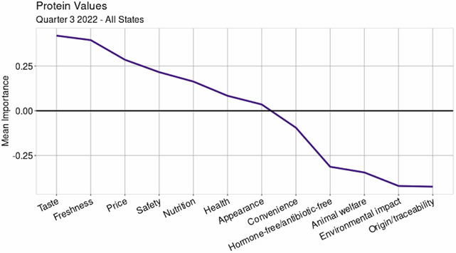 Non-price factors like consumer tastes and preferences are equally important for beef demand. The K-State Meat Demand Monitor tracks the relative importance of several meat protein attributes using monthly consumer surveys. Results consistently show that taste, freshness, price, and safety are the top four factors for consumers when purchasing protein (see the third figure). The implication is that beef demand prospects remain positive as long as the cattle industry continues to align itself with consumer preference and takes strategic steps to provide a product that hits the mark on the factors highlighted in the third figure.