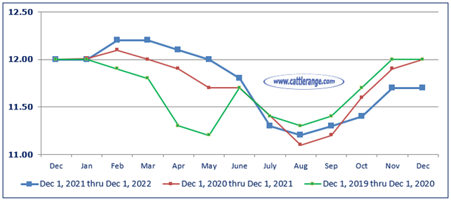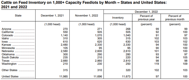 Cattle and calves on feed for the slaughter market in the United States for feedlots with capacity of 1,000 or more head totaled 11.7 million head on December 1, 2022. The inventory was 3 percent below December 1, 2021.