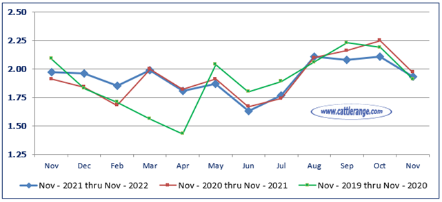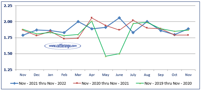 Marketings of fed cattle during November totaled 1.89 million head, 1 percent above 2021. Marketings were the highest for November since the series began in 1996.