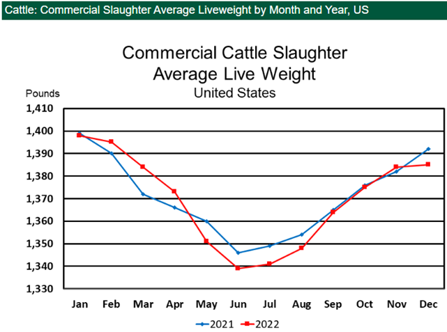 - Beef production, at 2.22 billion pounds, was 6 percent below the previous year. Cattle slaughter totaled 2.68 million head, down 5 percent from December 2021. The average live weight was down 7 pounds from the previous year, at 1,385 pounds.