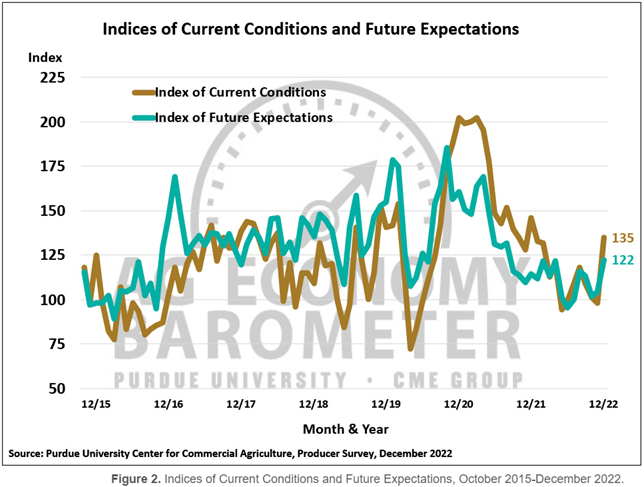Producer sentiment improved sharply in December as the Purdue University-CME Group Ag Economy Barometer Index reading of 126 was 24 points higher than a month earlier. Although U.S. farmers were more positive regarding both the current situation as well as their expectations for the future, by far the biggest improvement was in their assessment of current conditions. The Current Conditions Index reached 135, 37 points higher than in November while the Future Expectations Index hit 122, 18 points above a month earlier. The Purdue University-CME Group Ag Economy Barometer sentiment index is calculated each month from 400 U.S. agricultural producers’ responses to a telephone survey. This month’s survey was conducted from December 5-9, 2022.