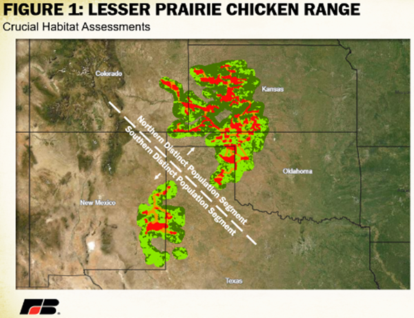The lesser prairie chicken (LPC) is a medium-sized brown and white striped chicken-like grouse found in western Kansas, western Oklahoma, eastern New Mexico, southeastern Colorado and the Texas Panhandle. The birds inhabit shortgrass prairies and are well known for their lekking behavior in which males gather in small clearings called leks and inflate bright red air sacs in their neck and “dance.” The final rule distinguishes two populations of LPC known as distinct population segments (DPS). The Northern DPS inhabits the Texas Panhandle, Oklahoma, Kansas and Colorado and will be listed as threatened while the Southern DPS, located in West Texas and New Mexico, will be listed as endangered.