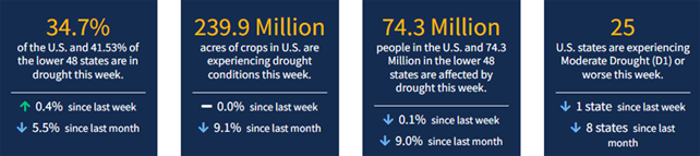 This week, drought conditions remain mostly status quo, and the current extreme weather will impact next week’s U.S. Drought Monitor map. That said, the Upper Midwest, Plains, and a few other areas saw improvements. Meanwhile, southern Texas and Florida continue to worsen.