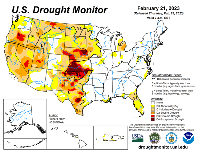 As of February 21, 2023, 34.70% of the U.S. and Puerto Rico and 41.53% of the lower 48 states are in drought, according to the U.S. Drought Monitor.