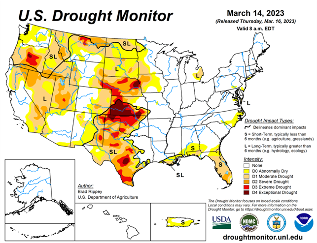 As of March 14, 2023, 29.9% of the U.S. & Puerto Rico and 35.79% of the lower 48 states are in drought, according to the U.S. Drought Monitor.