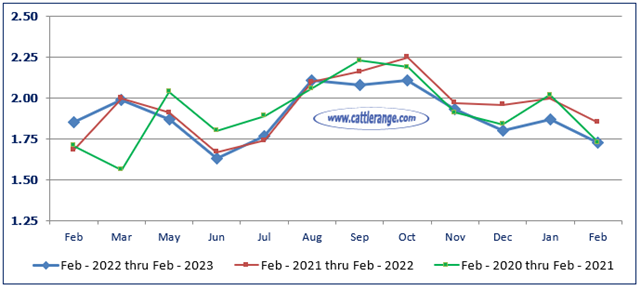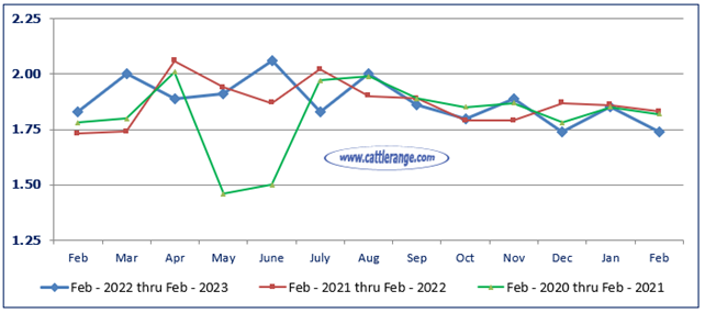 Marketings of fed cattle during February totaled 1.74 million head, 5 percent below 2022.